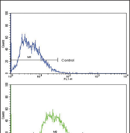 Flow cytometric analysis of HepG2 cells using ABCG2 (BCRP) Antibody (C-term)(bottom histogram) compared to a negative control cell (top histogram). FITC-conjugated goat-anti-rabbit secondary antibodies were used for the analysis. |