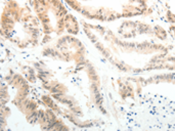 The image is immunohistochemistry of paraffin-embedded Human colon cancer tissue using P11162(ABL2 Antibody) at dilution 1/25. (Original magnification: ×200) |