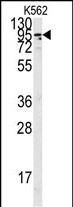 Western blot analysis of anti-ACE2 C-term Pab (Cat. #P30083) in K562 cell line lysates (35ug/lane). ACE2(arrow) was detected using the purified Pab. |