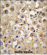 Formalin-fixed and paraffin-embedded human testis tissue reacted with ACE2 (SARS Receptor) Antibody (C-term) (Cat.#P30083), which was peroxidase-conjugated to the secondary antibody, followed by DAB staining. This data demonstrates the use of this antibody for immunohistochemistry; clinical relevance has not been evaluated. |