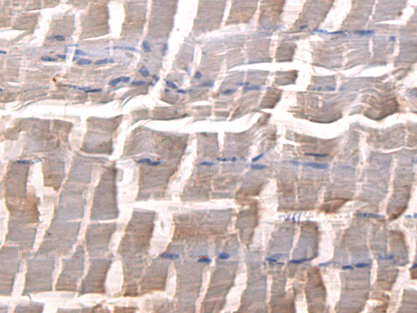 The image is immunohistochemistry of paraffin-embedded Human skeletal muscle tissue using P05248(ACTN2 Antibody) at dilution 1/50. (Original magnification: ×200) |