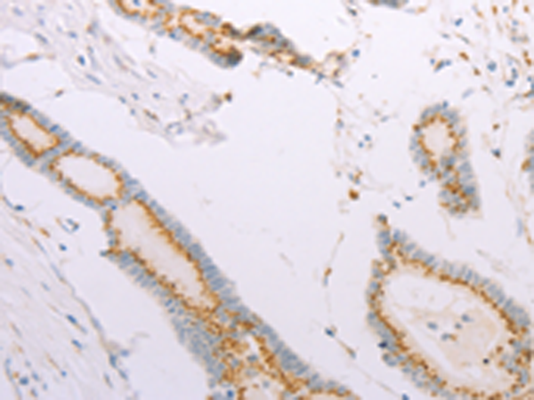 The image is immunohistochemistry of paraffin-embedded Human colon cancer tissue using P04538(ADAM28 Antibody) at dilution 1/30. (Original magnification: ×200) |