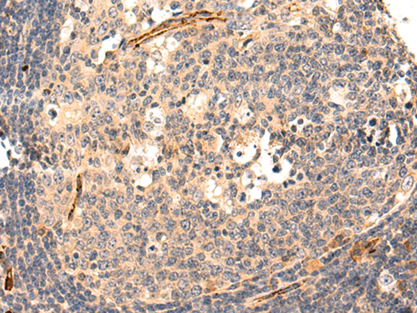 The image is immunohistochemistry of paraffin-embedded Human thyroid cancer tissue using P04542(ADAMTS15 Antibody) at dilution 1/50. (Original magnification: ×200) |