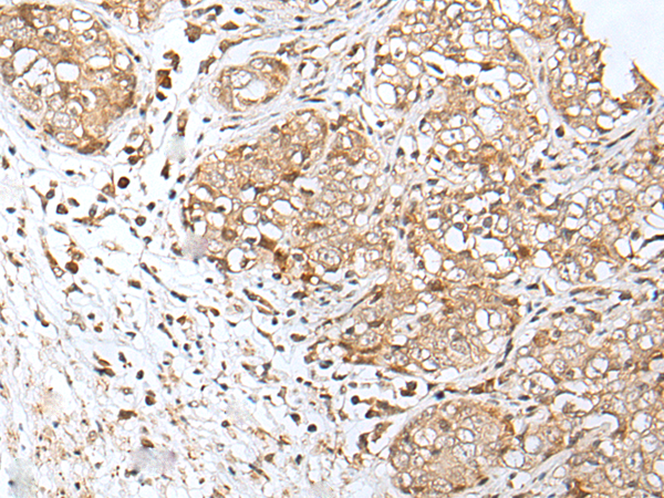 The image is immunohistochemistry of paraffin-embedded Human esophagus cancer tissue using P12597(ADAMTS3 Antibody) at dilution 1/30. (Original magnification: ×200) |
