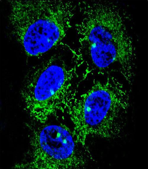 Confocal immunofluorescent analysis of ADH7 Antibody (C-Term) (Cat. #P32618) with NCI-H460 cell followed by Alexa Fluor® 488-conjugated goat anti-rabbit lgG (green). DAPI was used to stain the cell nuclear (blue). |
