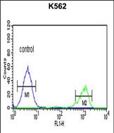 ADH7 Antibody (C-Term) (Cat. #P32618) flow cytometric analysis of K562 cells (right histogram) compared to a negative control cell (left histogram).FITC-conjugated goat-anti-rabbit secondary antibodies were used for the analysis. |