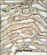 ADH7 Antibody (C-Term) (Cat. #P32618) IHC analysis in formalin fixed and paraffin embedded lung tissue followed by peroxidase conjugation of the secondary antibody and DAB staining. This data demonstrates the use of the ADH7 Antibody (C-Term) for immunohistochemistry. Clinical relevance has not been evaluated. |