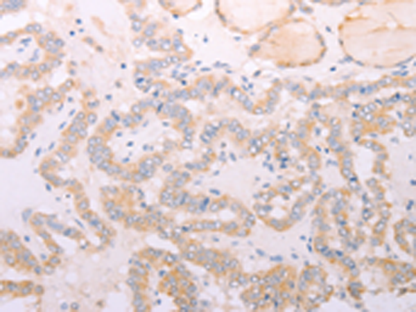 The image is immunohistochemistry of paraffin-embedded Human thyroid cancer tissue using P07066(ADIPOR1 Antibody) at dilution 1/20. (Original magnification: ×200) |