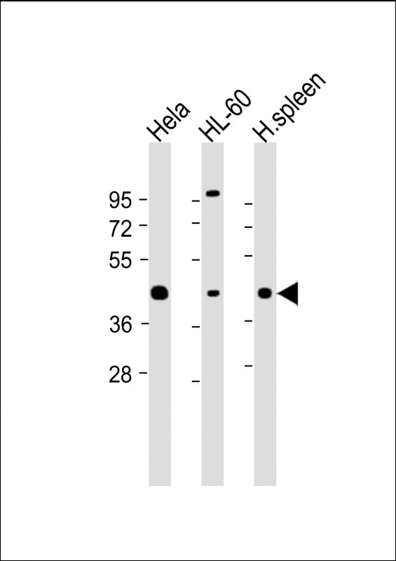 All lanes : Anti-HLA-B Antibody (N-term) at 1:2000 dilution Lane 1: Hela whole cell lysate Lane 2: HL-60 whole cell lysate Lane 3: H. spleen whole lysate Lysates/proteins at 20 µg per lane. Secondary Predicted band size : 40 kDa Blocking/Dilution buffer: 5% NFDM/TBST. |