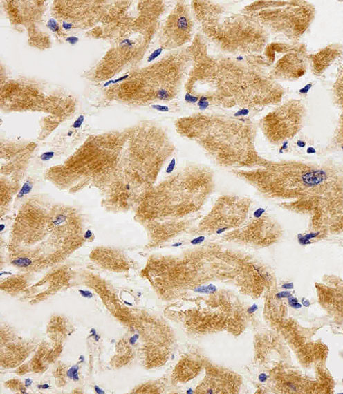 Immunohistochemical analysis of paraffin-embedded H.heart section using AK4 Antibody (Center)(Cat#P32607). P32607 was diluted at 1:25 dilution. A peroxidase-conjugated goat anti-rabbit IgG at 1:400 dilution was used as the secondary antibody, followed by DAB staining. |