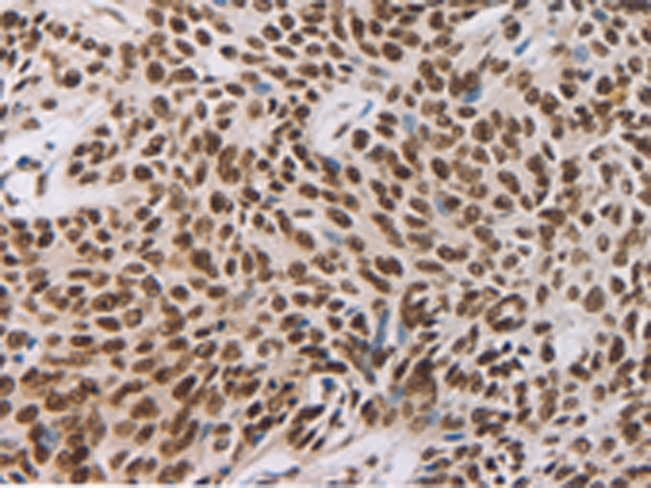 The image is immunohistochemistry of paraffin-embedded Human esophagus cancer tissue using P04141(AKAP8 Antibody) at dilution 1/30. (Original magnification: ×200) |