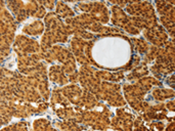 The image is immunohistochemistry of paraffin-embedded Human thyroid cancer tissue using P11177(AKR1A1 Antibody) at dilution 1/30. (Original magnification: ×200) |
