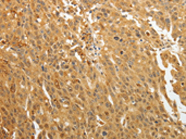 The image is immunohistochemistry of paraffin-embedded Human ovarian cancer tissue using P11177(AKR1A1 Antibody) at dilution 1/30. (Original magnification: ×200) |