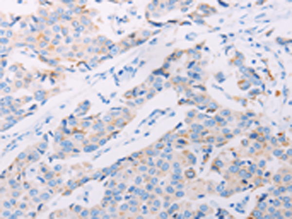 The image is immunohistochemistry of paraffin-embedded Human breast cancer tissue using P11435(AKT2 Antibody) at dilution 1/70. (Original magnification: ×200) |