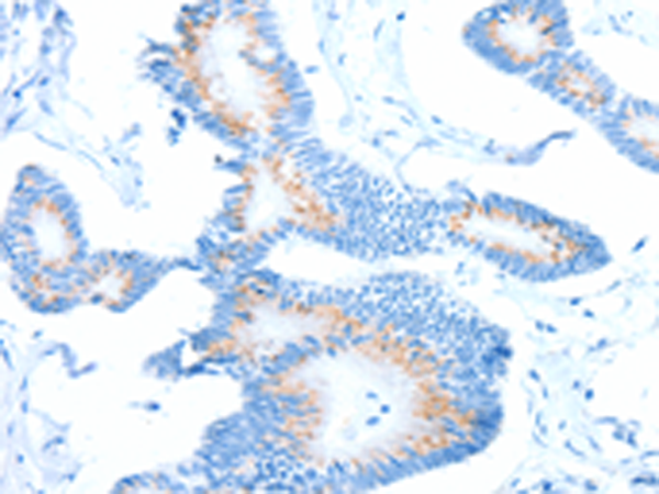The image is immunohistochemistry of paraffin-embedded Human colon cancer tissue using P11436(AKT3 Antibody) at dilution 1/40. (Original magnification: ×200) |