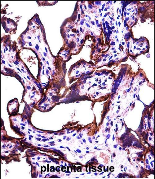 ALPPL2 Antibody (N-term) (Cat. #P31309)immunohistochemistry analysis in formalin fixed and paraffin embedded human placenta tissue followed by peroxidase conjugation of the secondary antibody and DAB staining.This data demonstrates the use of ALPPL2 Antibody (N-term) for immunohistochemistry. Clinical relevance has not been evaluated. |