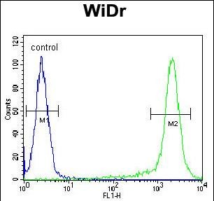AMAC1L2 Antibody (N-term) (Cat. #P30869) flow cytometric analysis of WiDr cells (right histogram) compared to a negative control cell (left histogram).FITC-conjugated goat-anti-rabbit secondary antibodies were used for the analysis. |
