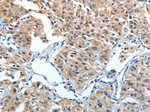 The image is immunohistochemistry of paraffin-embedded Human lung cancer tissue using P07079(ANGPT1 Antibody) at dilution 1/30. (Original magnification: ×200) |