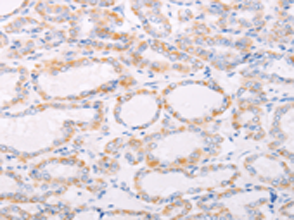 The image is immunohistochemistry of paraffin-embedded Human thyroid cancer tissue using P04283(ANKRD26 Antibody) at dilution 1/25. (Original magnification: ×200) |
