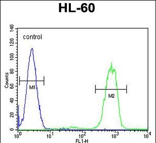 ANKRD40 Antibody (C-term) (Cat. #P30950) flow cytometric analysis of HL-60 cells (right histogram) compared to a negative control cell (left histogram).FITC-conjugated goat-anti-rabbit secondary antibodies were used for the analysis. |
