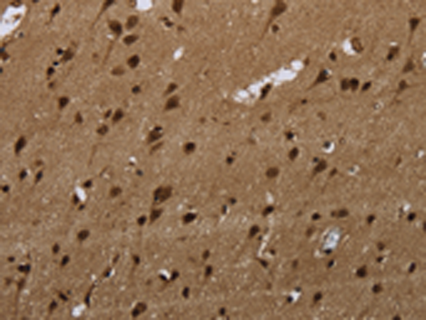 The image is immunohistochemistry of paraffin-embedded Human brain tissue using P05009(ANP32E Antibody) at dilution 1/20. (Original magnification: ×200) |