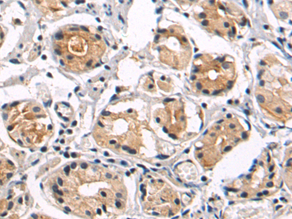 The image is immunohistochemistry of paraffin-embedded Human gastric cancer tissue using P04710(ANXA2R Antibody) at dilution 1/50. (Original magnification: ×200) |