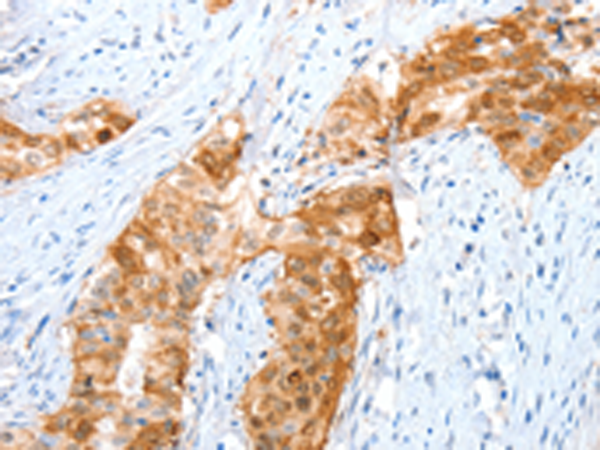 The image is immunohistochemistry of paraffin-embedded Human cervical cancer tissue using P07084(ANXA8 Antibody) at dilution 1/35. (Original magnification: ×200) |