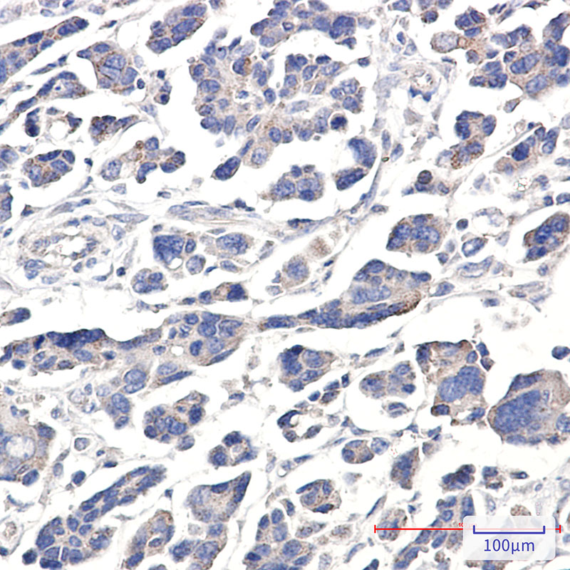 Immunohistochemistry analysis of paraffin-embedded Human Cholangiocarcinoma using APG5L/ATG5 antibody.High-pressure and temperature Sodium Citrate pH 6.0 was used for antigen retrieval. |