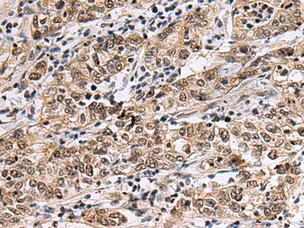 The image is immunohistochemistry of paraffin-embedded Human gastric cancer tissue using P03767(AR Antibody) at dilution 1/35. (Original magnification: ×200) |