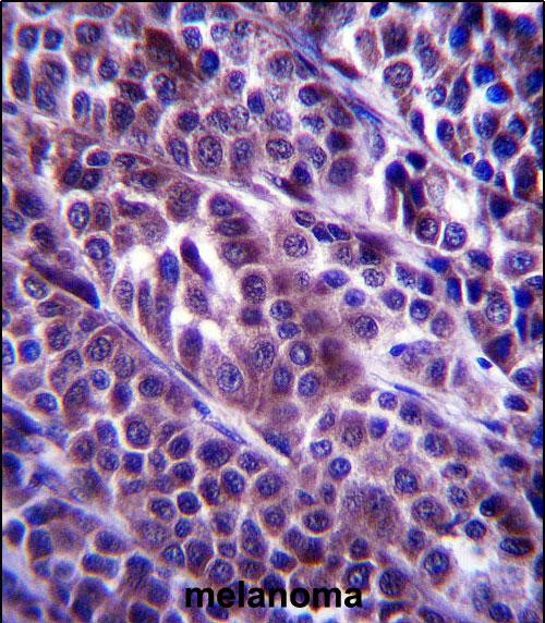 ARMC9 Antibody (N-term) (Cat. #P31287)immunohistochemistry analysis in formalin fixed and paraffin embedded human melanoma followed by peroxidase conjugation of the secondary antibody and DAB staining.This data demonstrates the use of ARMC9 Antibody (N-term) for immunohistochemistry. Clinical relevance has not been evaluated. |