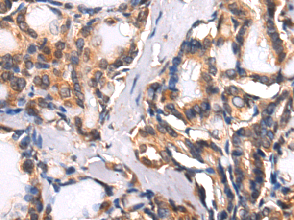 The image is immunohistochemistry of paraffin-embedded Human thyroid cancer tissue using P02756(ATG13 Antibody) at dilution 1/50. (Original magnification: ×200) |