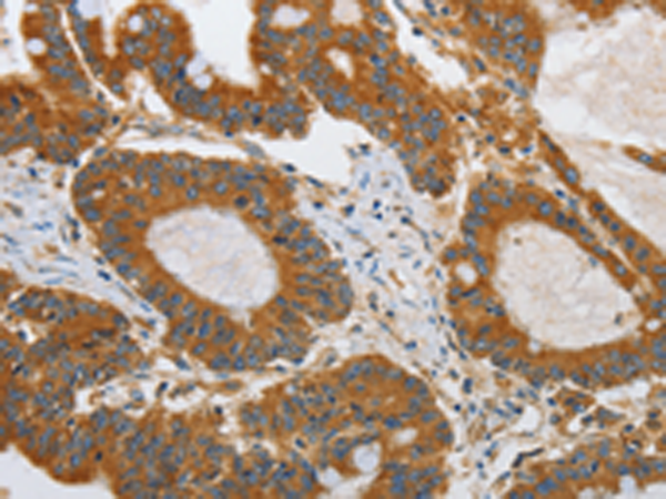 The image is immunohistochemistry of paraffin-embedded Human colon cancer tissue using P04600(ATG4A Antibody) at dilution 1/45. (Original magnification: ×200) |