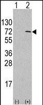 Western blot analysis of anti-hAPG4D-L235 Pab (Cat. #P30102) in 293 cell line lysates transiently transfected with the APG4D gene (2ug/lane). hAPG4D-L235(arrow) was detected using the purified Pab. |