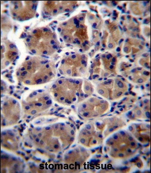 ATP1B3 Antibody (C-term) (Cat. #P31144)immunohistochemistry analysis in formalin fixed and paraffin embedded human stomach tissue followed by peroxidase conjugation of the secondary antibody and DAB staining.This data demonstrates the use of ATP1B3 Antibody (C-term) for immunohistochemistry. Clinical relevance has not been evaluated. |