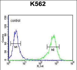 ATP2A1 Antibody (C-term) (Cat. #P32582) flow cytometric analysis of K562 cells (right histogram) compared to a negative control cell (left histogram).FITC-conjugated goat-anti-rabbit secondary antibodies were used for the analysis. |