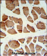 ATP2A1 Antibody (C-term) (Cat. #P32582) IHC analysis in formalin fixed and paraffin embedded human skeletal muscle followed by peroxidase conjugation of the secondary antibody and DAB staining. This data demonstrates the use of the ATP2A1 Antibody (C-term) for immunohistochemistry. Clinical relevance has not been evaluated. |