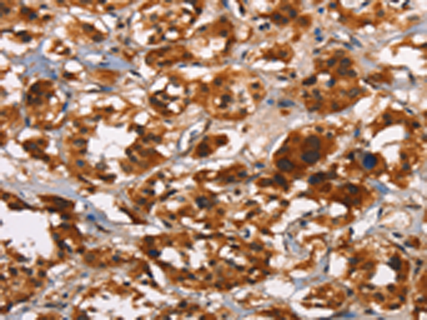 The image is immunohistochemistry of paraffin-embedded Human thyroid cancer tissue using P11589(ATRN Antibody) at dilution 1/50. (Original magnification: ×200) |