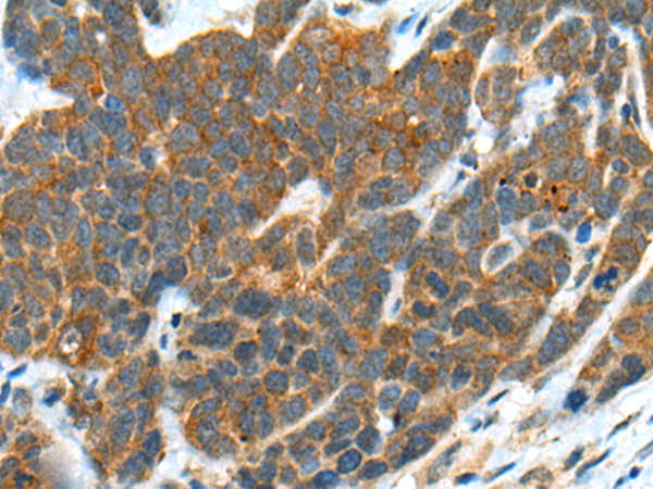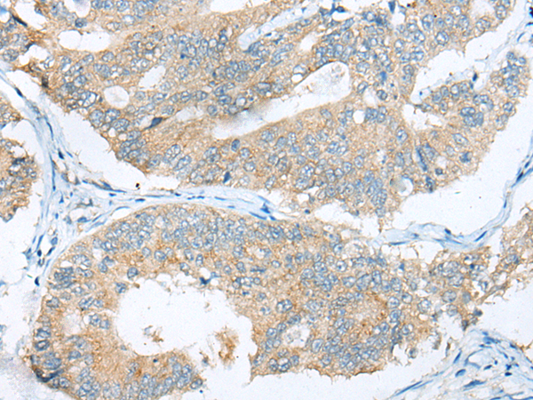 The image is immunohistochemistry of paraffin-embedded Human thyroid cancer tissue using P12936(B3GNT3 Antibody) at dilution 1/30. (Original magnification: ×200) |