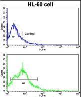 Flow cytometric analysis of HL-60 cells using BACE2 Antibody (Center)(bottom histogram) compared to a negative control cell (top histogram). FITC-conjugated goat-anti-rabbit secondary antibodies were used for the analysis. |