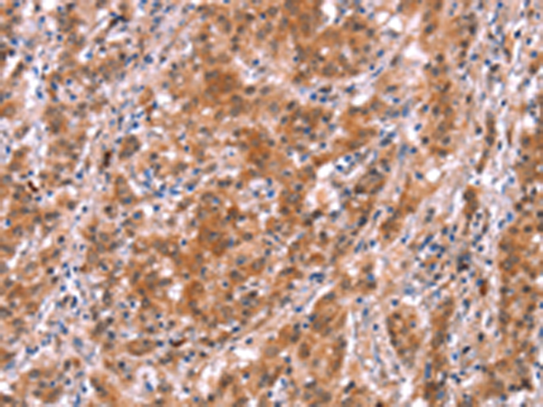 The image is immunohistochemistry of paraffin-embedded Human gastric cancer tissue using P04328(BCAR1 Antibody) at dilution 1/15. (Original magnification: ×200) |