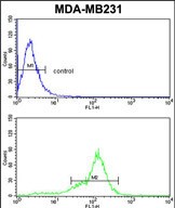 BCL2A1 Antibody (Center) (Cat. #P30452) flow cytometric analysis of MDA-MB231 cells (bottom histogram) compared to a negative control cell (top histogram).FITC-conjugated goat-anti-rabbit secondary antibodies were used for the analysis. |