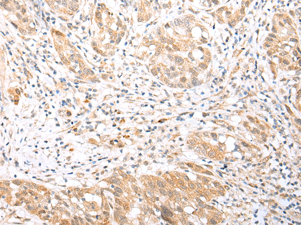 The image is immunohistochemistry of paraffin-embedded Human gastric cancer tissue using P05670(BCL2L11 Antibody) at dilution 1/30. (Original magnification: ×200) |
