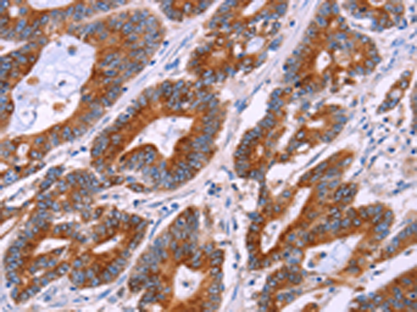 The image is immunohistochemistry of paraffin-embedded Human colon cancer tissue using P11241(BCR Antibody) at dilution 1/15. (Original magnification: ×200) |