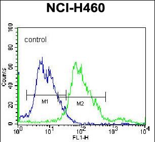 BEND4 Antibody (N-term) (Cat. #P31548) flow cytometric analysis of NCI-H460 cells (right histogram) compared to a negative control cell (left histogram).FITC-conjugated donkey-anti-rabbit secondary antibodies were used for the analysis. |