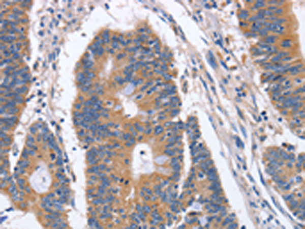 The image is immunohistochemistry of paraffin-embedded Human colon cancer tissue using P11602(BMP6 Antibody) at dilution 1/40. (Original magnification: ×200) |