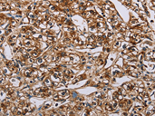 The image is immunohistochemistry of paraffin-embedded Human breast cancer tissue using P04721(BMP6 Antibody) at dilution 1/50. (Original magnification: ×200) |