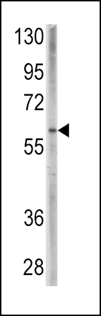 Western blot analysis of anti-BMPR1A Pab (Cat. #P32599) in CEM cell line lysates (35ug/lane). BMPR1A(arrow) was detected using the purified Pab. |