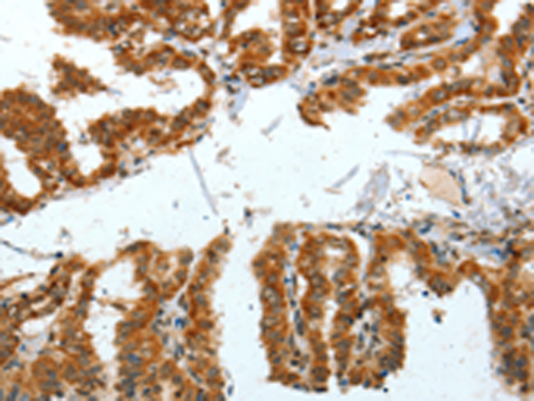 The image is immunohistochemistry of paraffin-embedded Human thyroid cancer tissue using P07042(BNIP1 Antibody) at dilution 1/30. (Original magnification: ×200) |