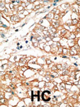 Formalin-fixed and paraffin-embedded human cancer tissue reacted with the primary antibody, which was peroxidase-conjugated to the secondary antibody, followed by DAB staining. This data demonstrates the use of this antibody for immunohistochemistry; clinical relevance has not been evaluated. BC = breast carcinoma; HC = hepatocarcinoma. |