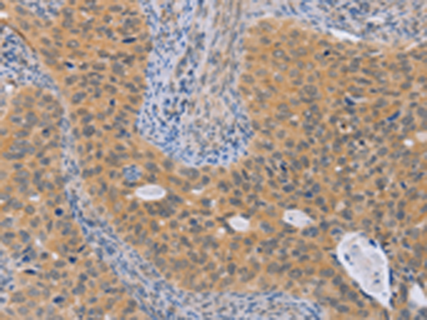 The image is immunohistochemistry of paraffin-embedded Human cervical cancer tissue using P11608(BRS3 Antibody) at dilution 1/50. (Original magnification: ×200) |